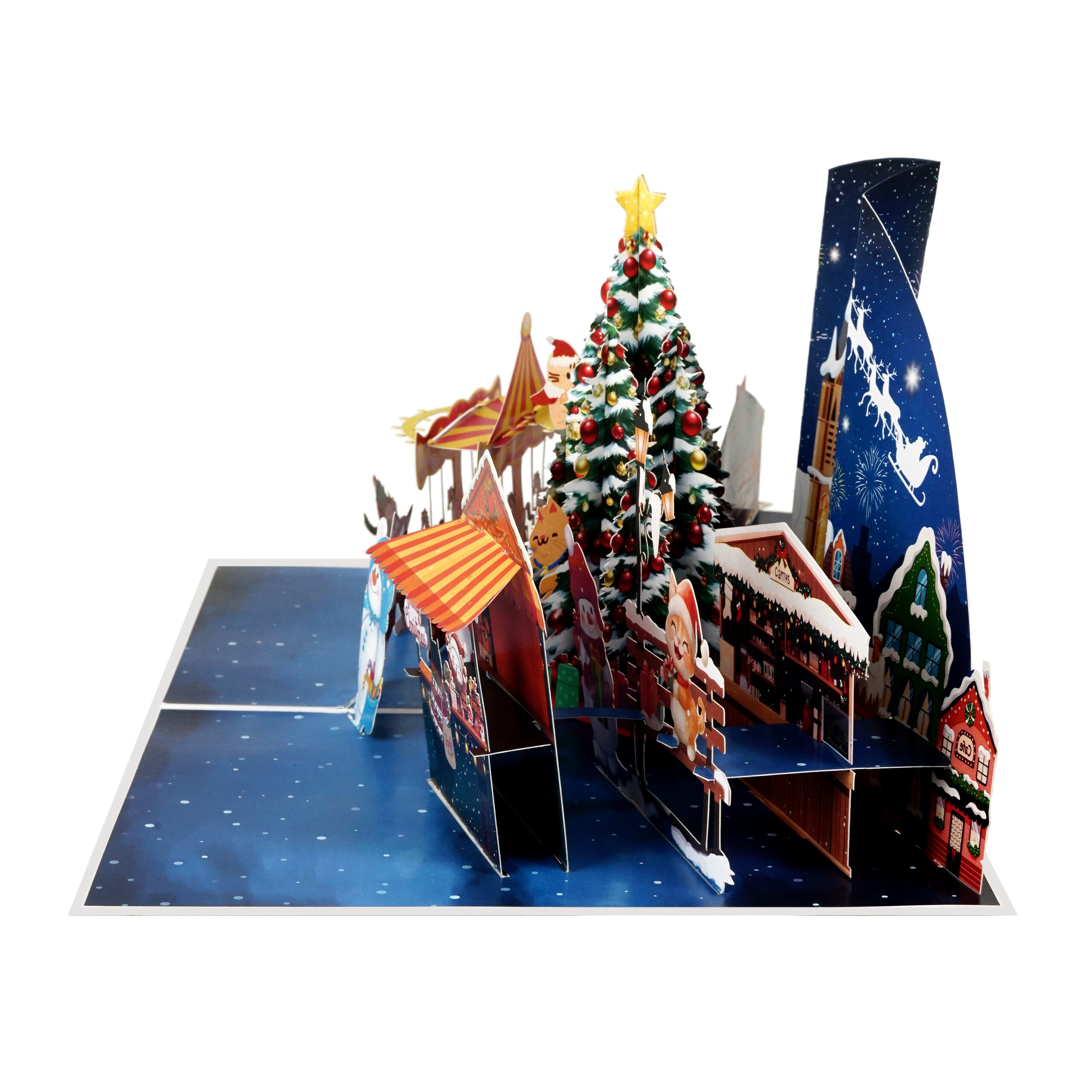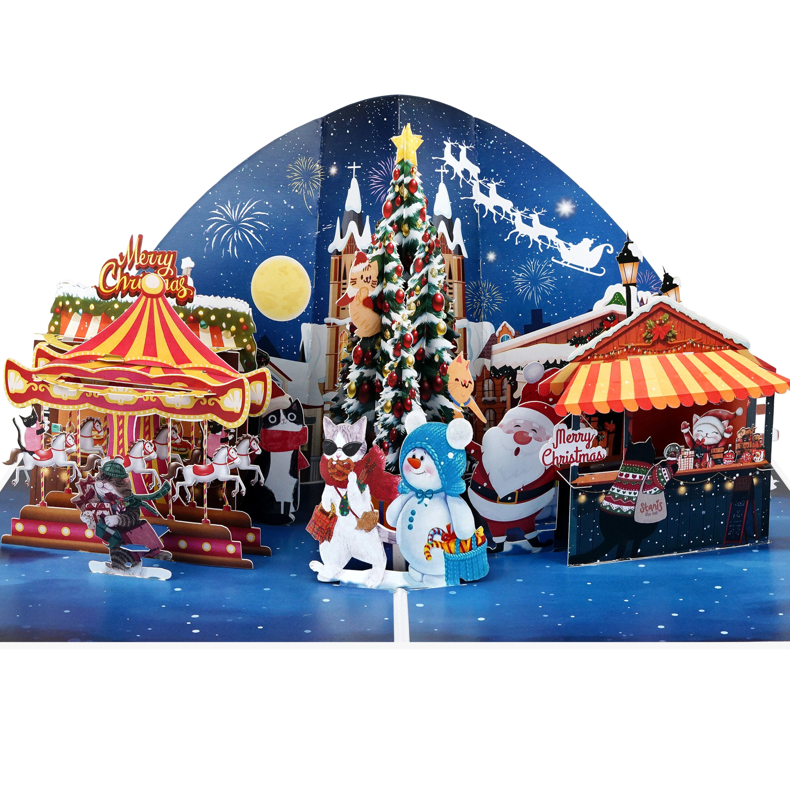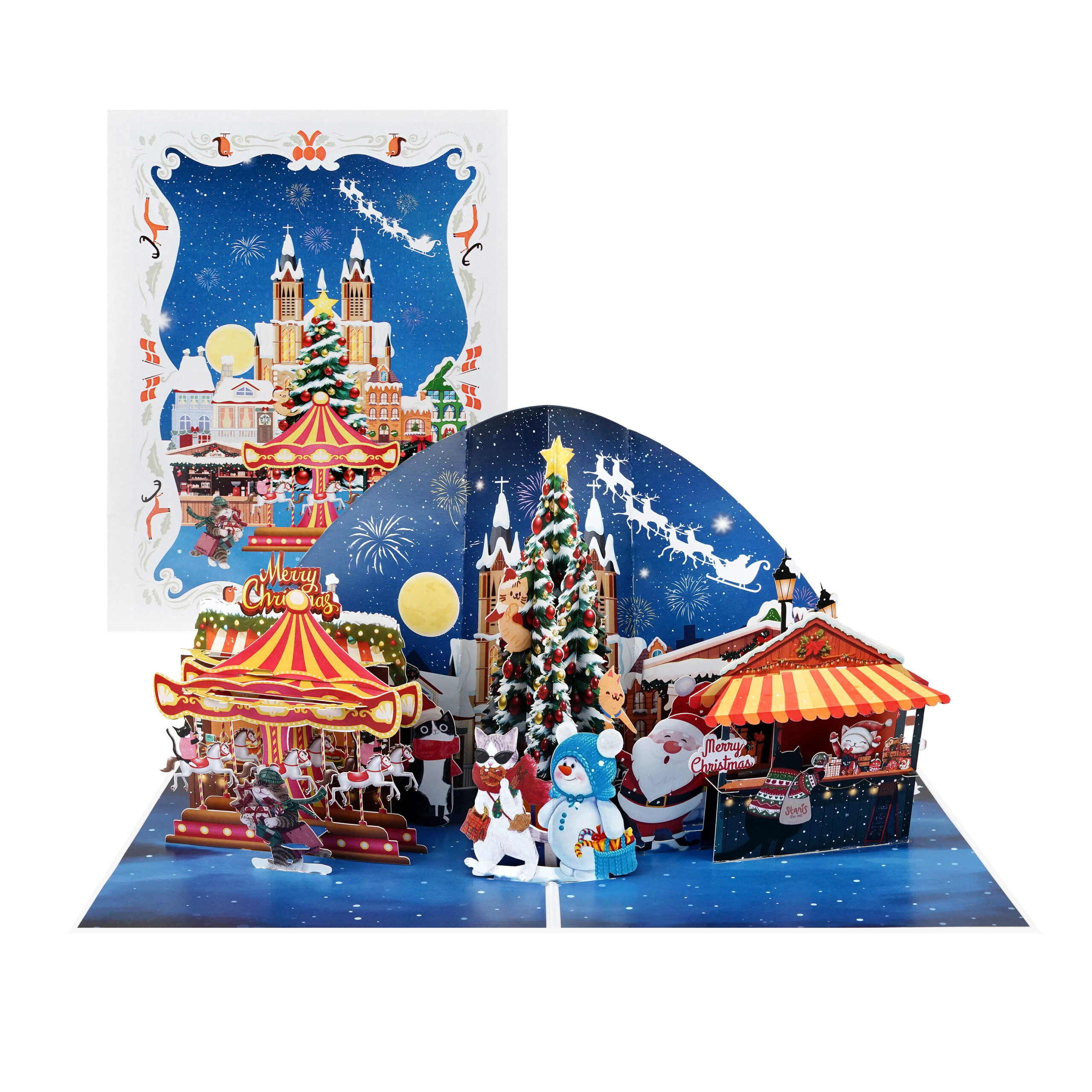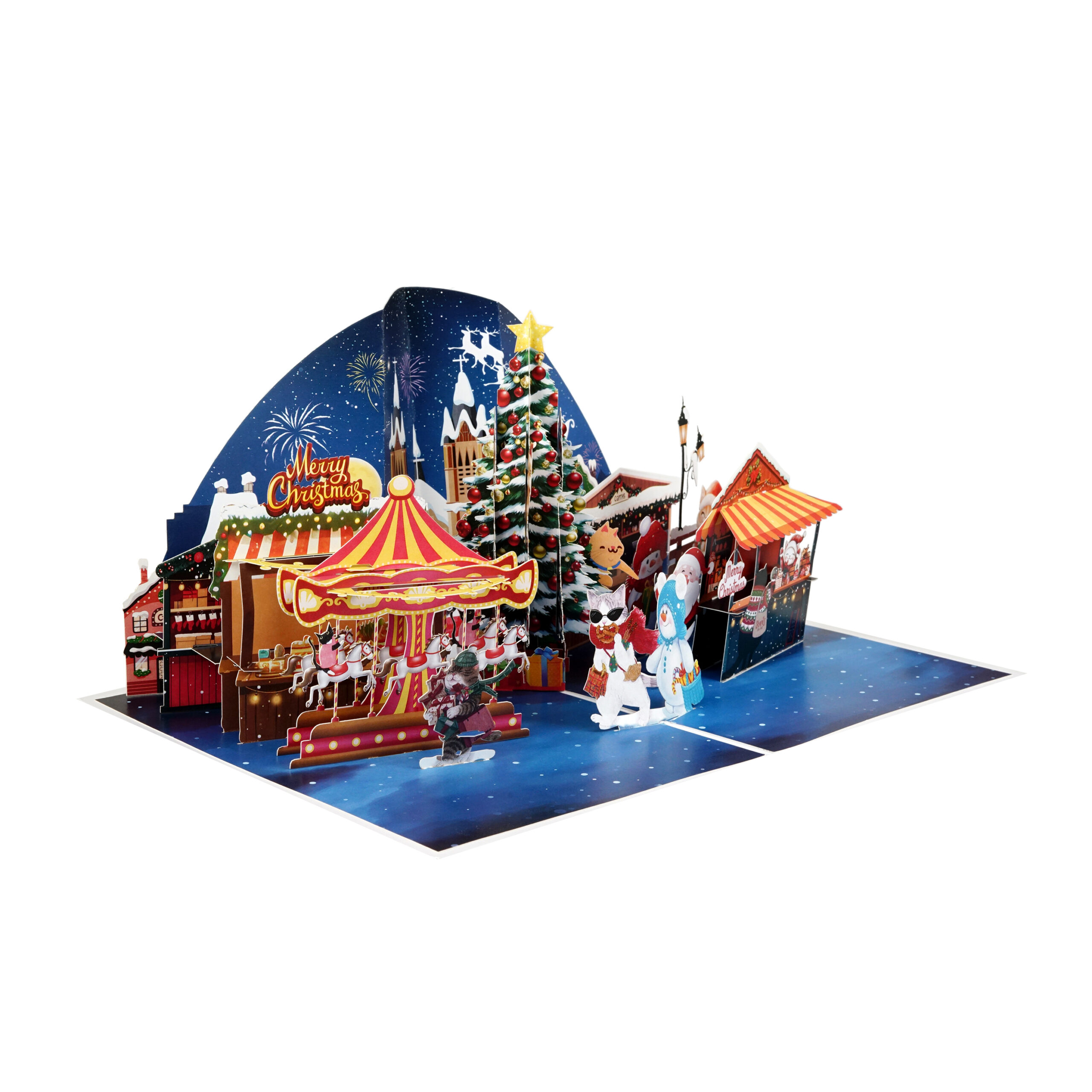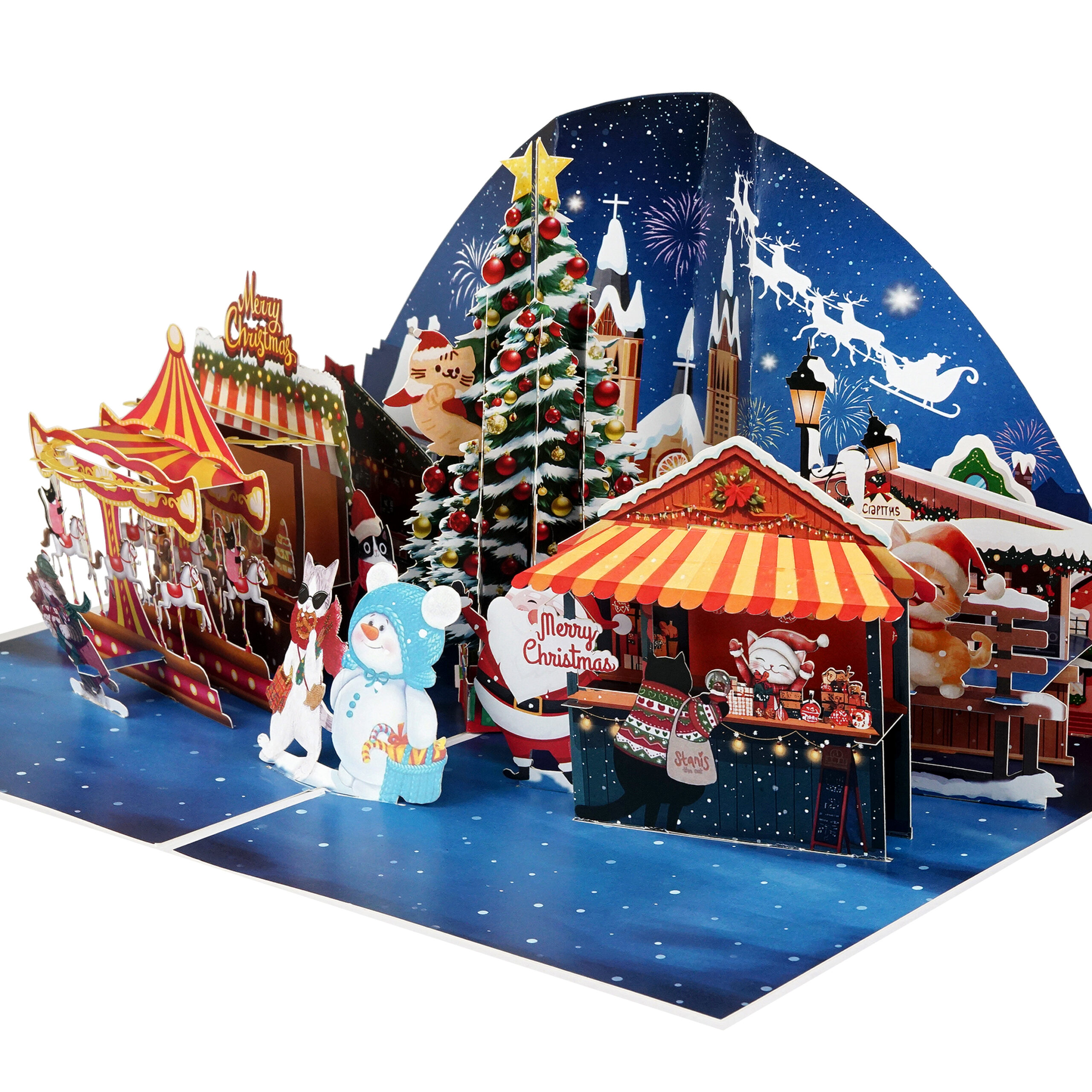 This intricate 3D greeting card showcases a vibrant winter scene featuring Santa Claus, a festive market, joyful snowmen, a dazzling carousel, and a beautifully decorated Christmas tree under a starry night sky.