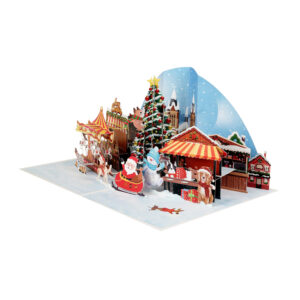 Step into the magical world of the holidays with our Christmas Town Pop-up Card. This festive 3D greeting card opens up to reveal a bustling Christmas village scene – complete with Santa riding a sleigh, a cheerful snowman, market stalls, a carousel, and a dazzling Christmas tree.