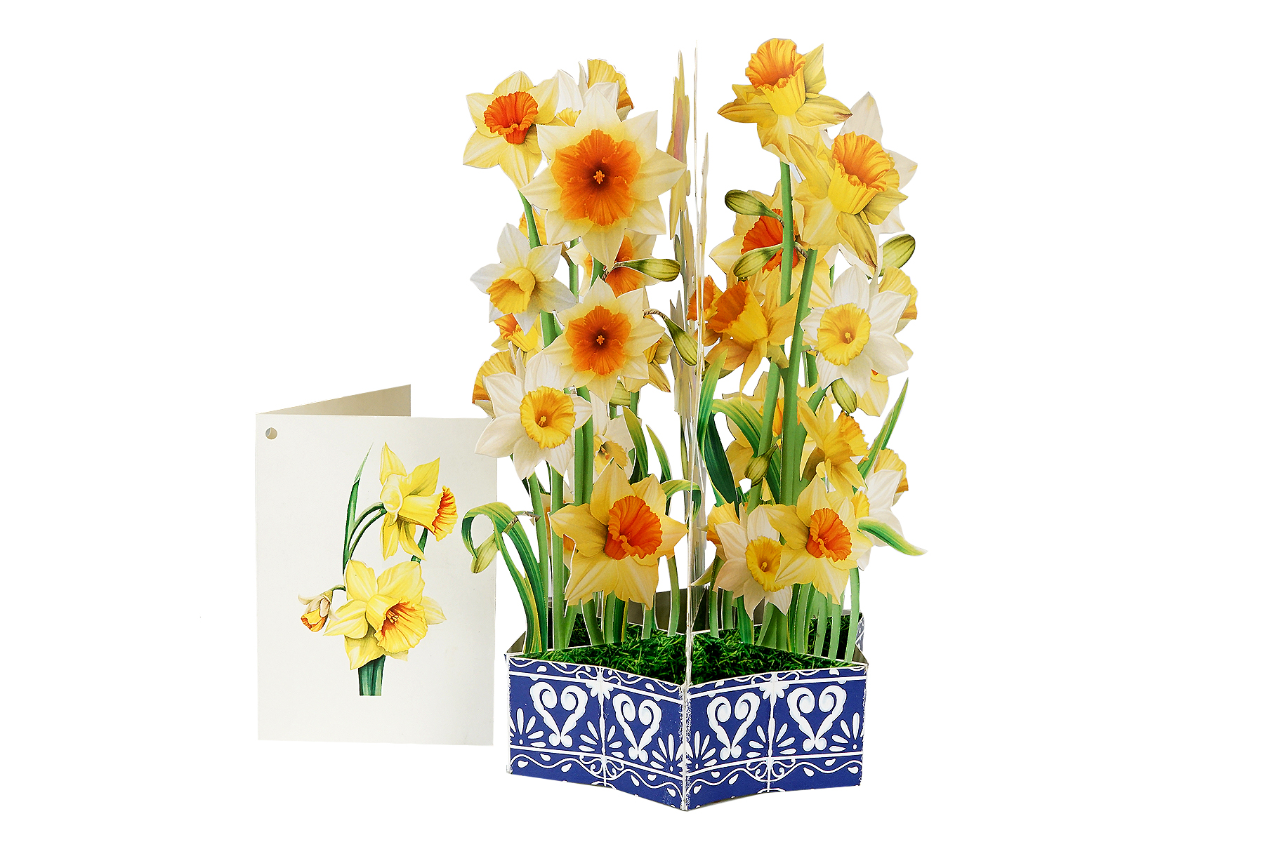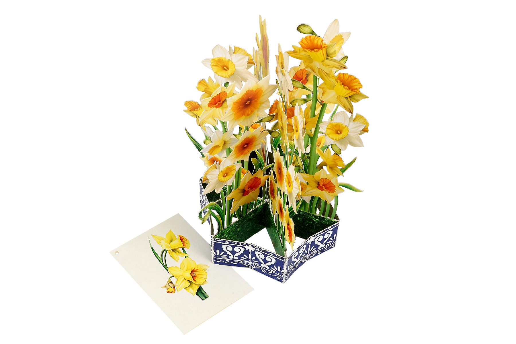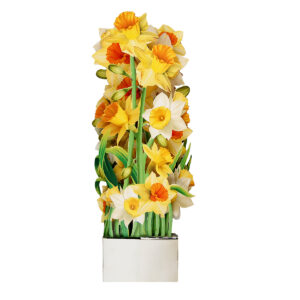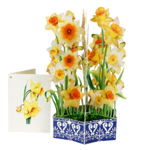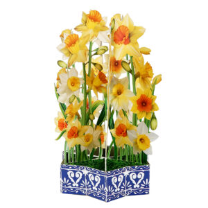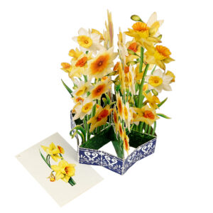 Bring sunshine and cheer into someone’s day with our Daffodil Flower Basket Pop-up Card. This handcrafted card features a lush bouquet of yellow and white daffodils, artfully arranged in a decorative blue basket with intricate patterns.
