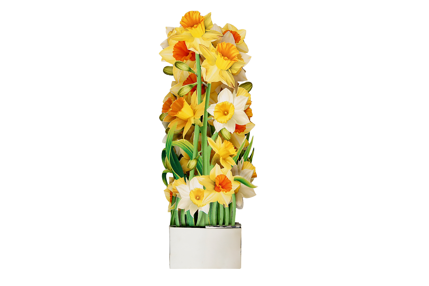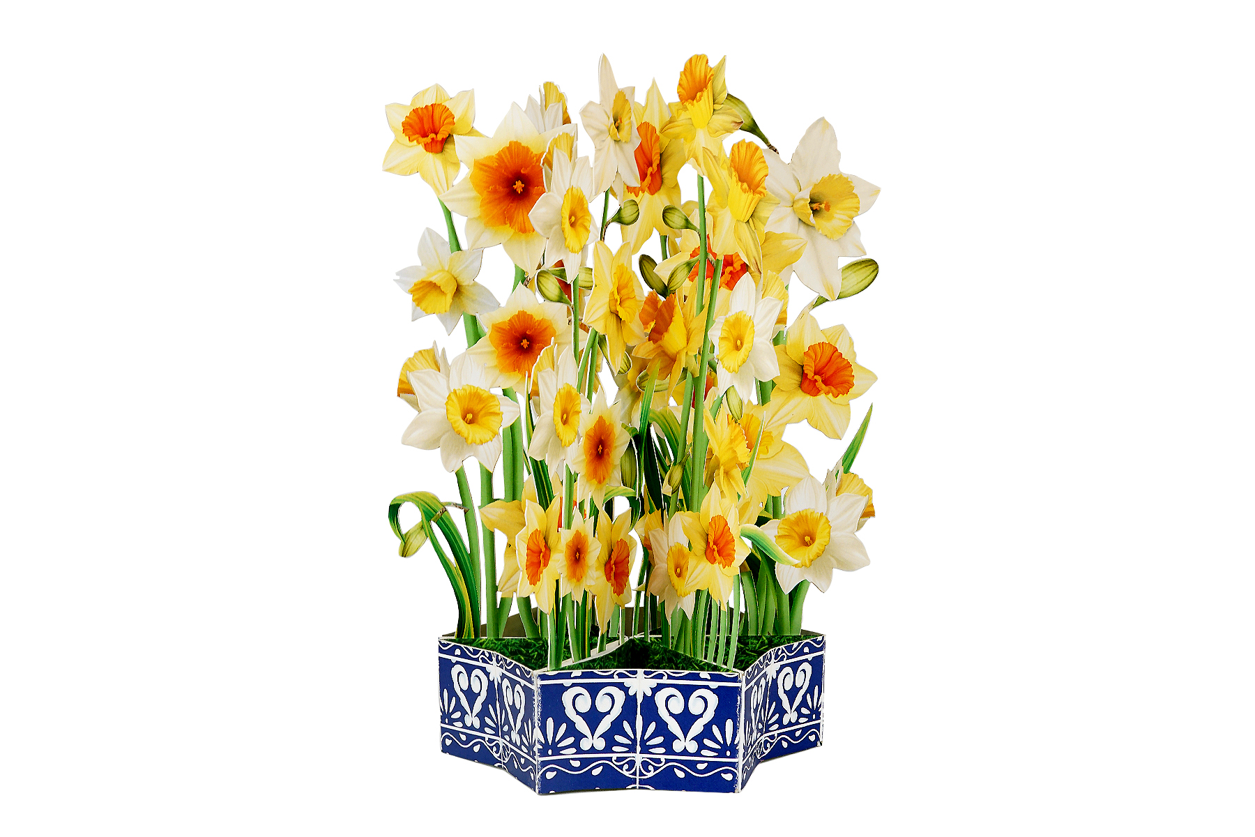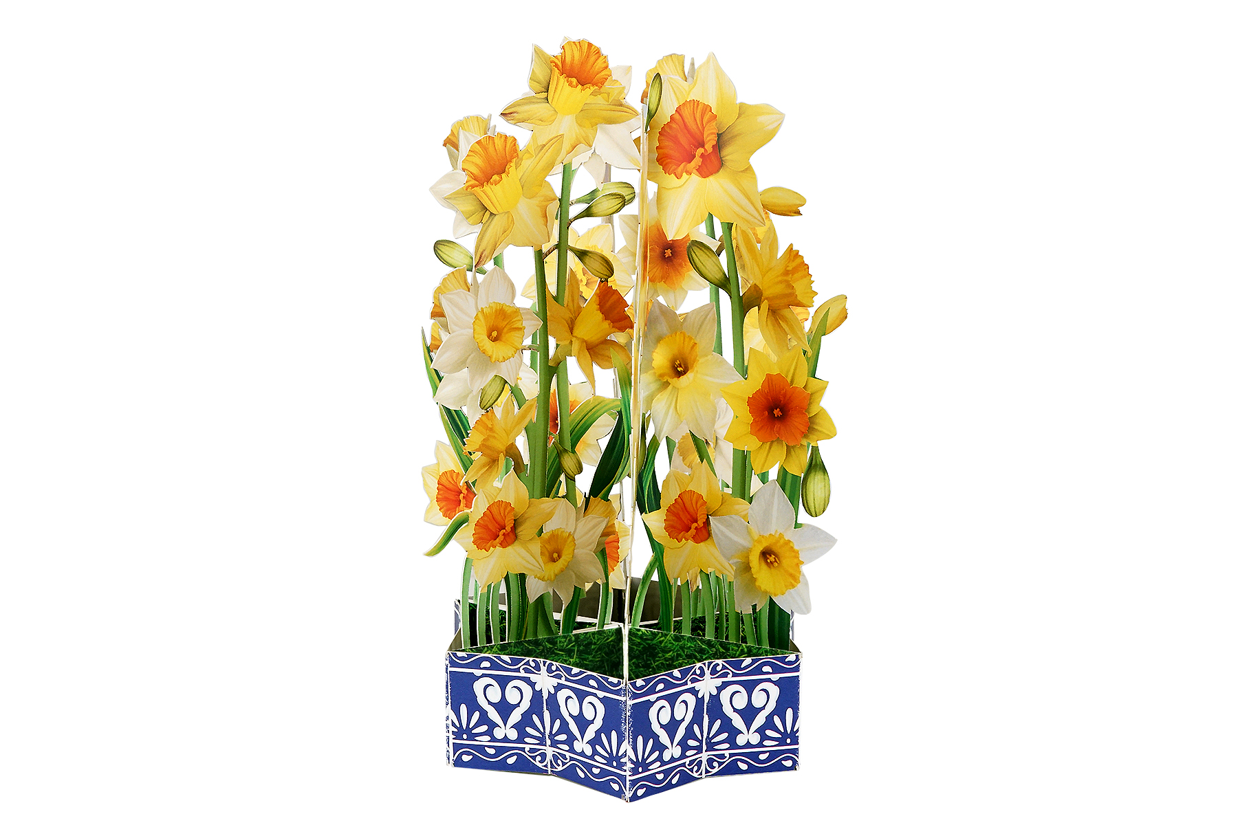 Bring sunshine and cheer into someone’s day with our Daffodil Flower Basket Pop-up Card. This handcrafted card features a lush bouquet of yellow and white daffodils, artfully arranged in a decorative blue basket with intricate patterns.