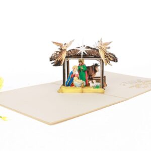The front of this stunning pop up card describes an immortal scene of the married couple Joseph and Mary praying underneath the North Star, angels and above Baby Jesus in the front of his stable door where horses, donkeys and other animals live in. Complicated and solemn detailed, the cover of nativity pop up card is really glorious.