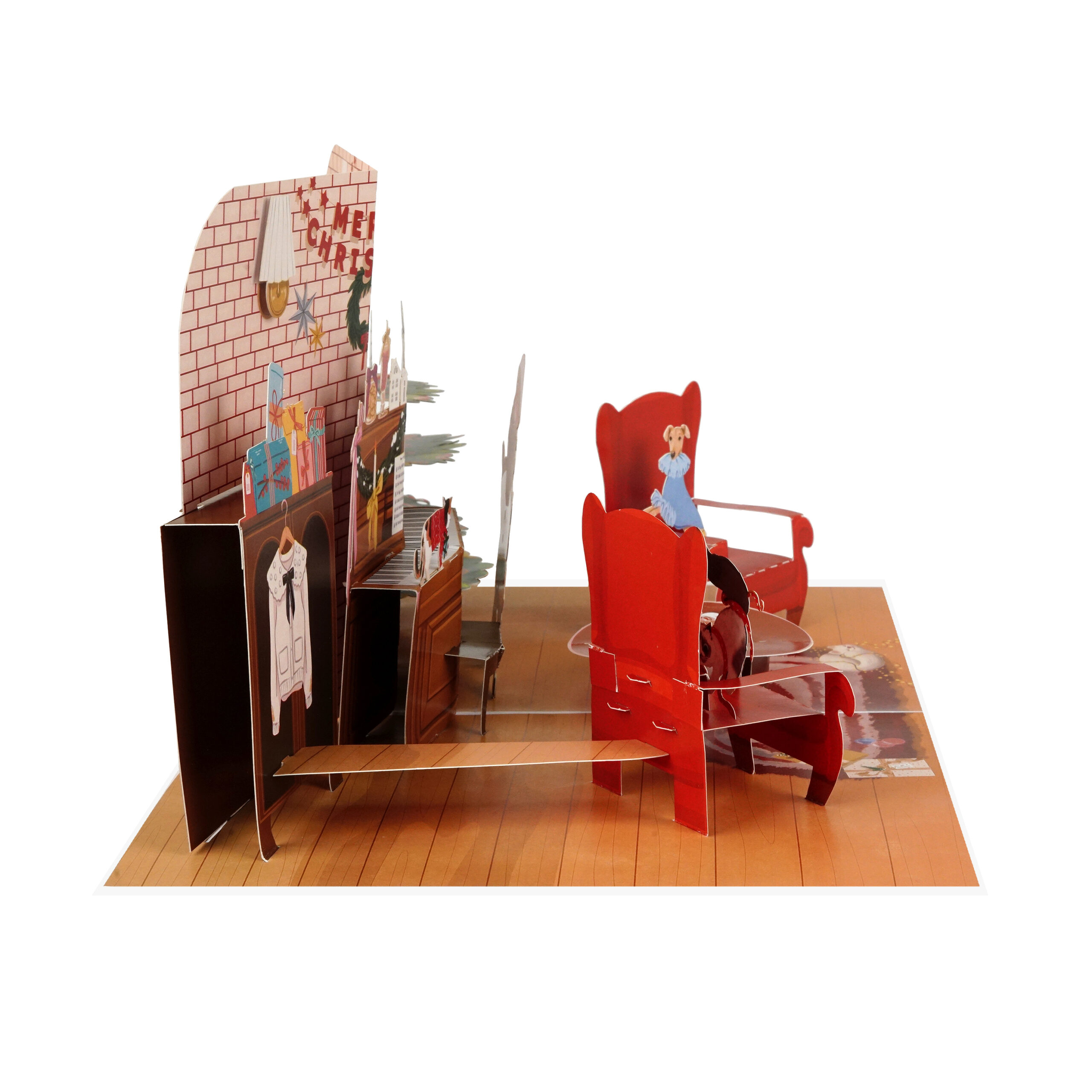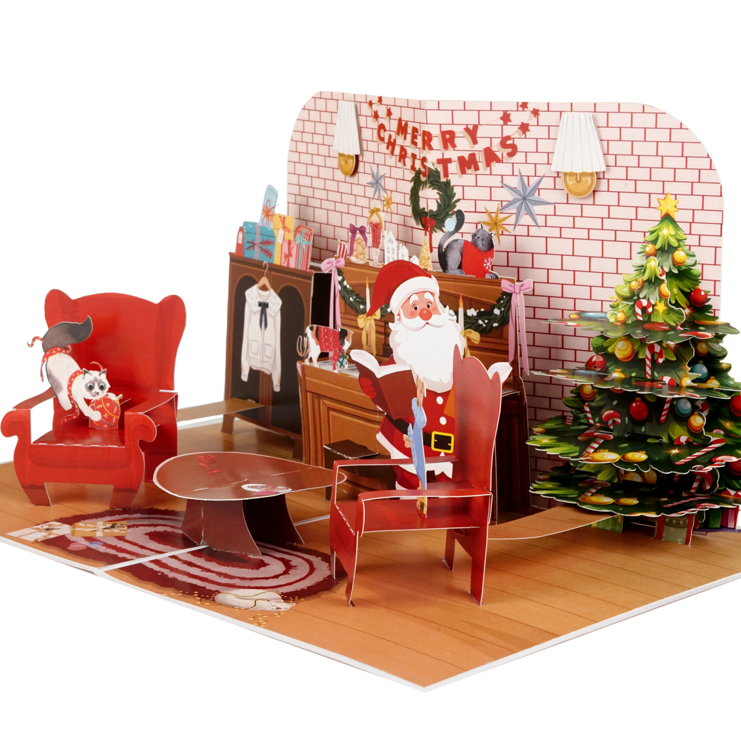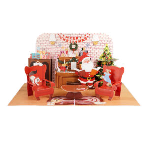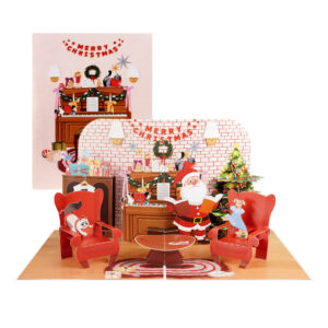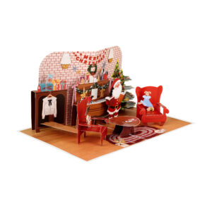 Whether you’re sending holiday wishes to friends, family, or coworkers, this pop-up card is a perfect keepsake for the season. The rich illustrations include classic Christmas elements such as a wreath, stockings, a fluffy cat on a red armchair, and Santa spreading cheer. The intricate laser-cut and hand-assembled design makes it more than just a card — it’s a mini festive scene that recipients will love to display.